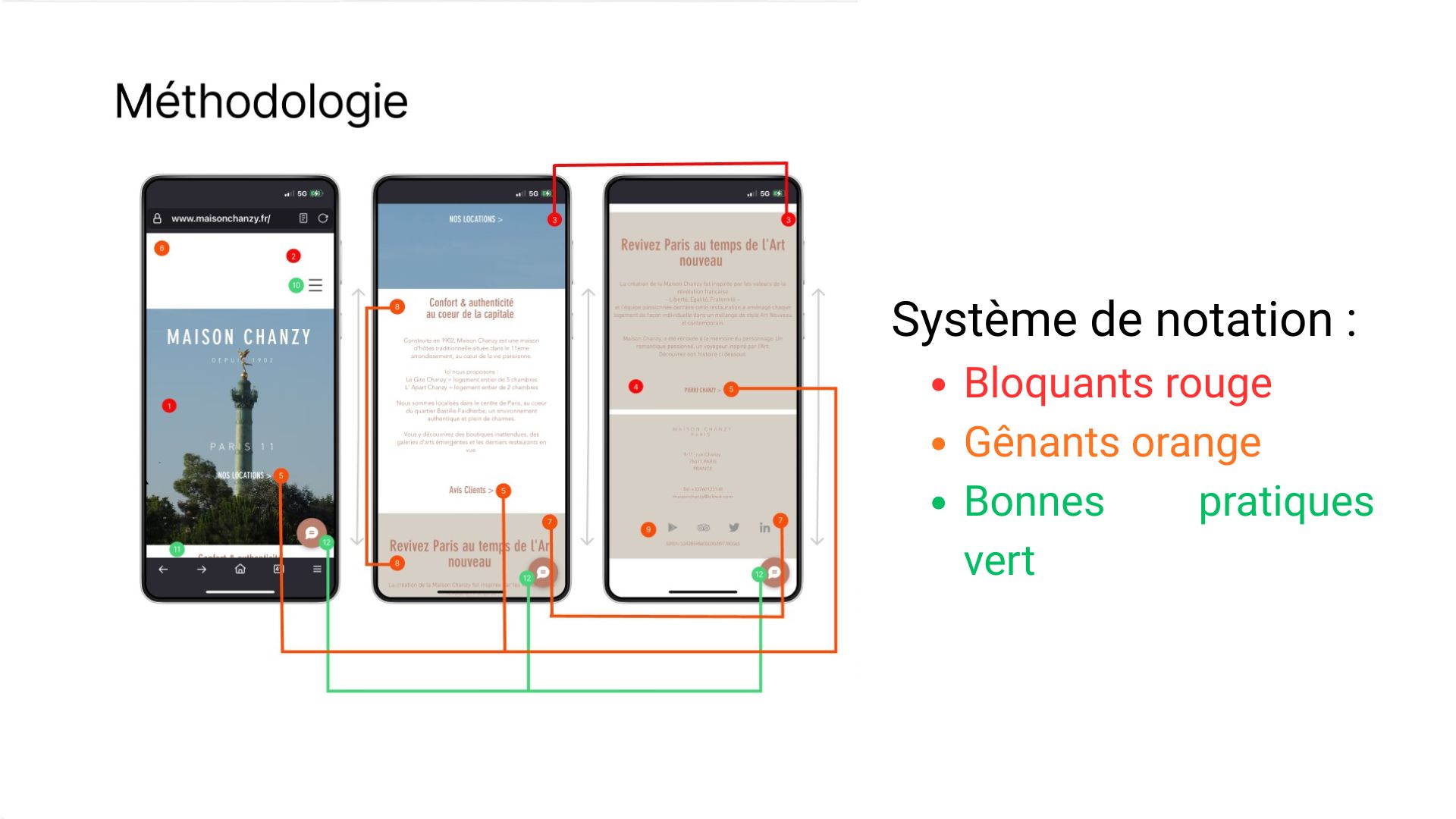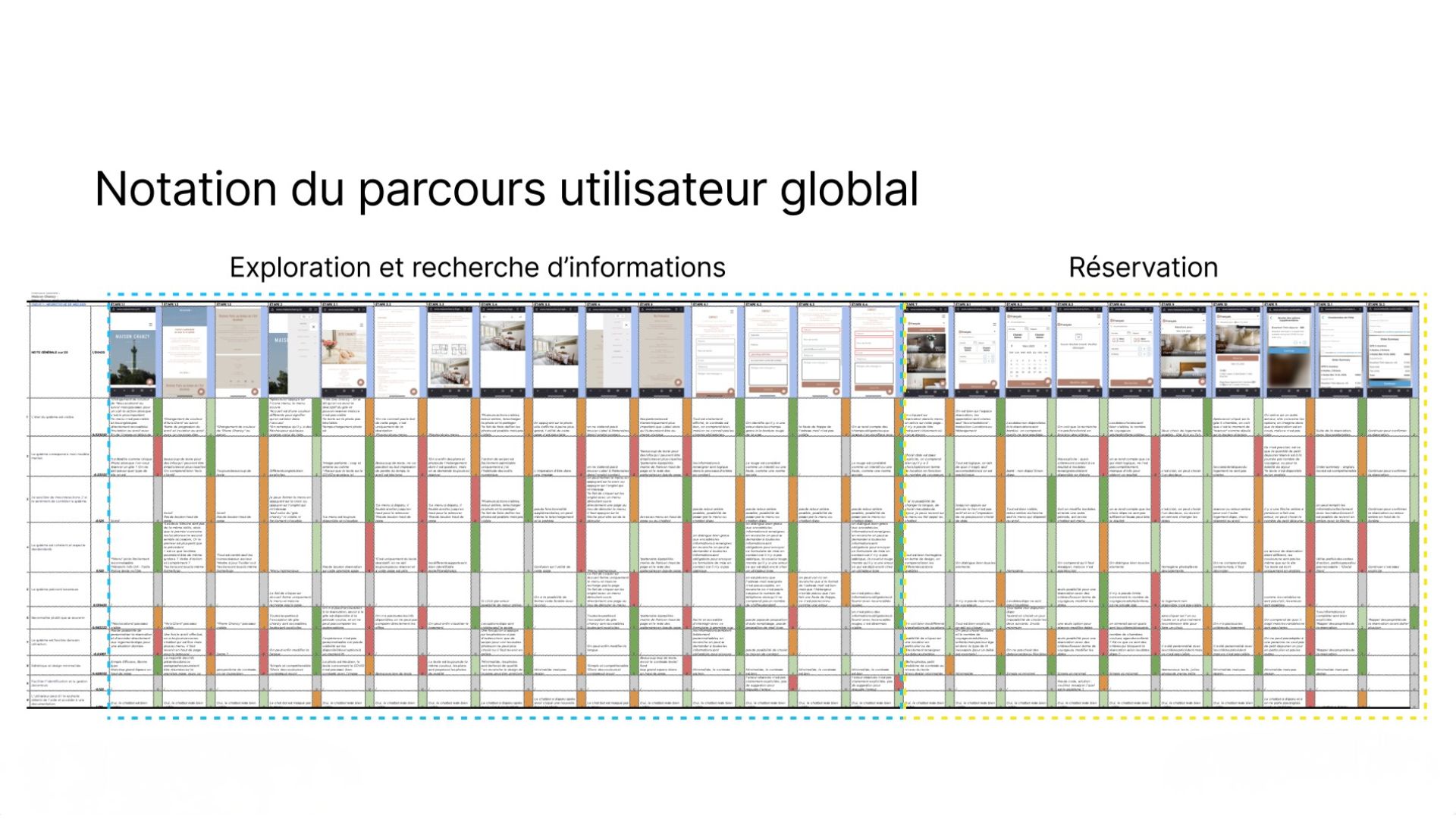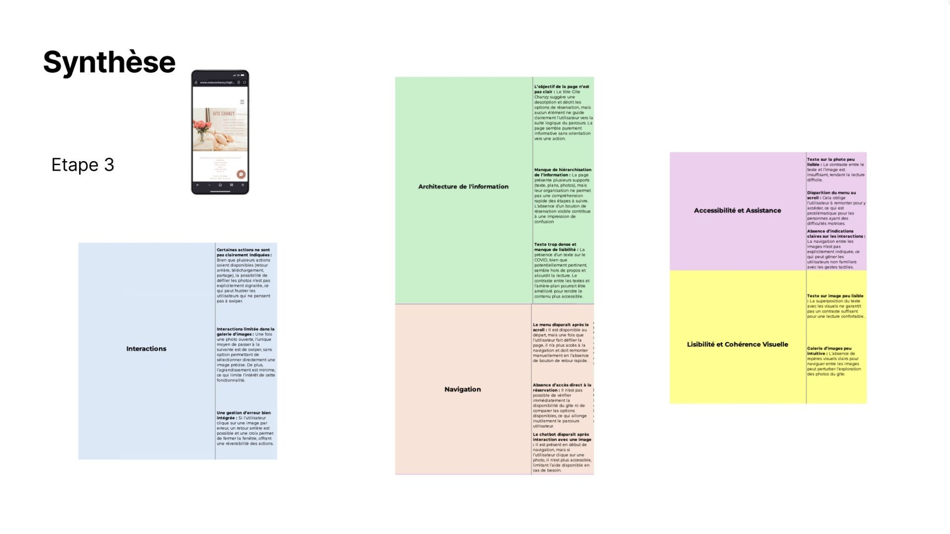 L'audit couvre l'intégralité du parcours mobile de Maison Chanzy, de la page d'accueil jusqu'à la validation de la réservation, soit 12 étapes analysées en deux phases : exploration et tunnel de réservation. Les heuristiques de Nielsen et l'outil WAVE ont permis d'identifier des problèmes de contraste, de hiérarchie visuelle, de navigation et de lisibilité du formulaire. 10 recommandations thématiques ont été formulées et priorisées — de la clarté de l'offre à l'assistance continue — accompagnées d'une roadmap UX en 4 phases intégrant des cycles de tests utilisateurs et un suivi par KPI (conversion, abandon, lisibilité).