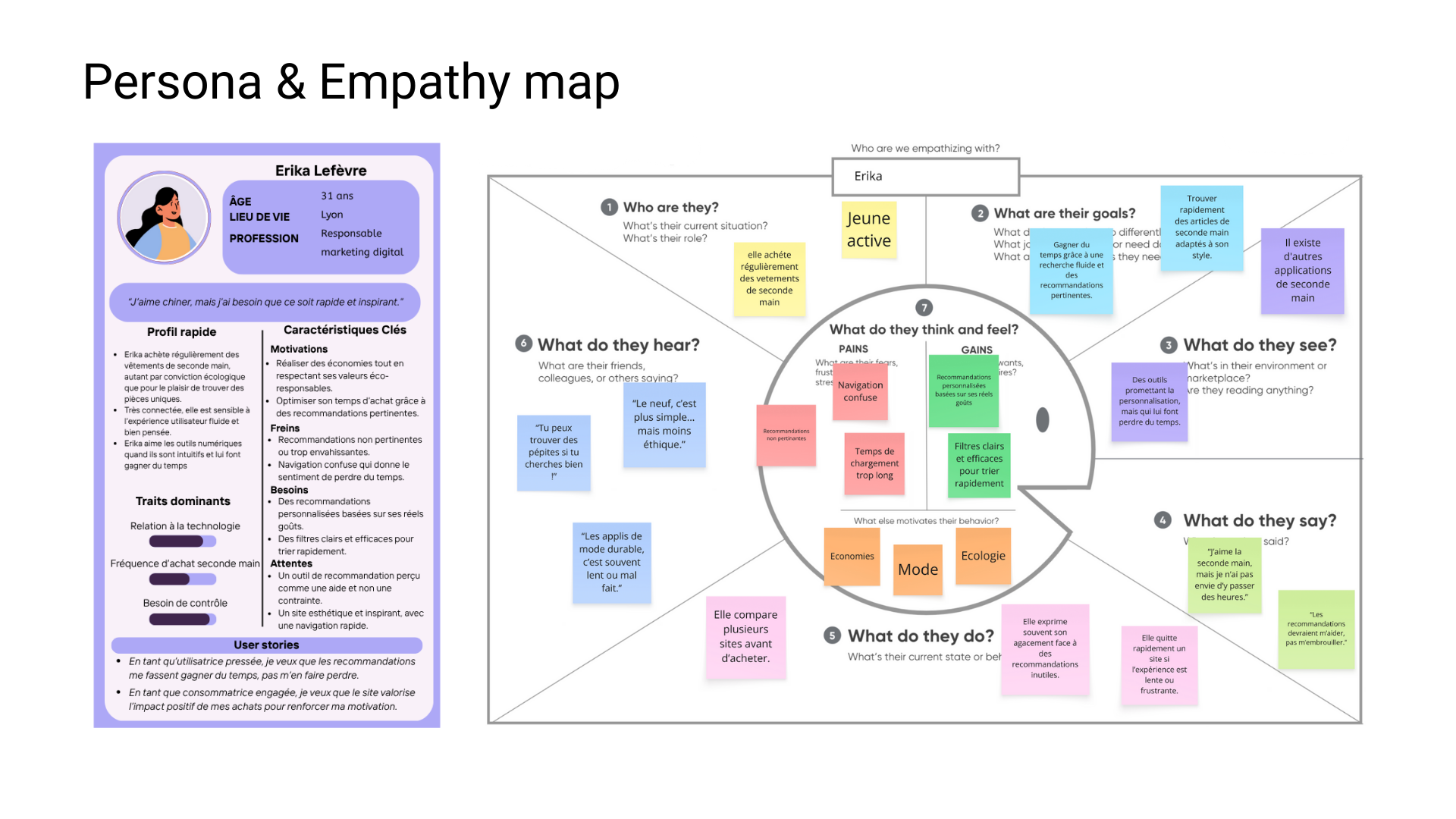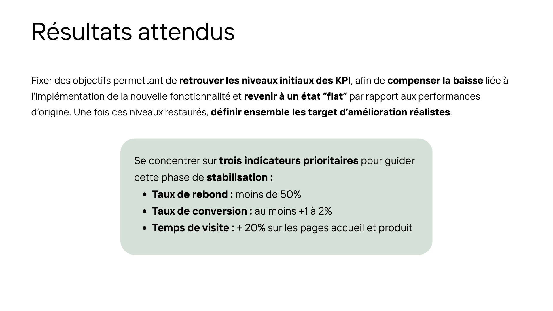 L'analyse part de données concrètes : le taux de rebond a bondi de 45% à 60% (+15 pts) et le taux de conversion a été divisé par 2 (2% → 1%) depuis le déploiement de la fonctionnalité. Le croisement des données quantitatives et qualitatives a permis de cartographier 6 irritants structurels — pertinence limitée des recommandations, problèmes techniques, navigation intrusive, absence de feedback, surcharge informationnelle, émotions de rejet. 5 recommandations ont été formulées autour de 3 axes : alléger le parcours, renforcer la transparence, offrir plus de contrôle utilisateur. Les objectifs de stabilisation définis ciblent un taux de rebond sous 50%, un gain de conversion de +1 à 2% et une augmentation du temps de visite de +20% sur les pages clés.