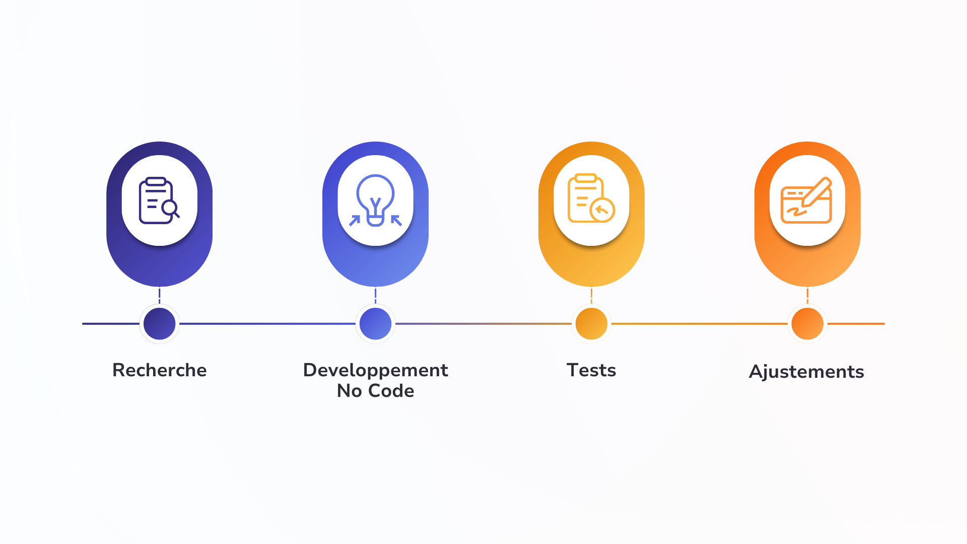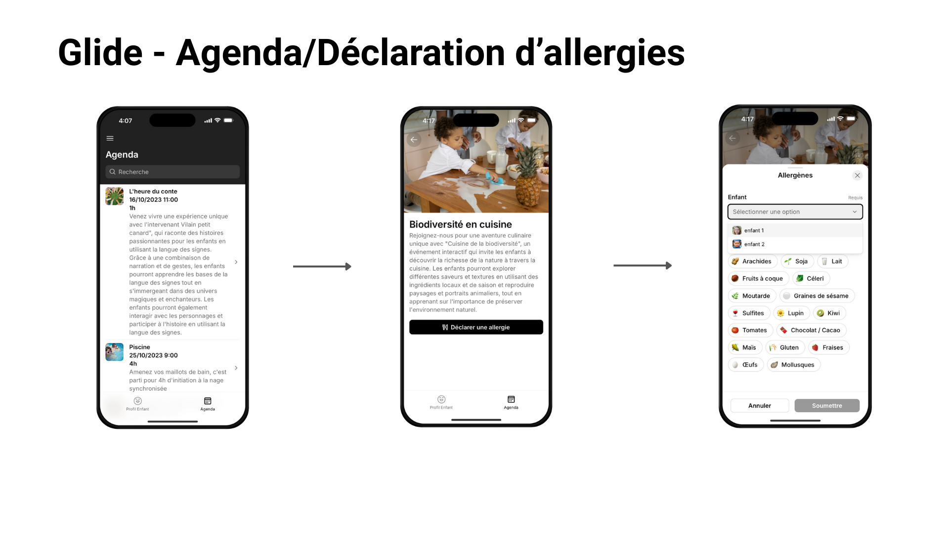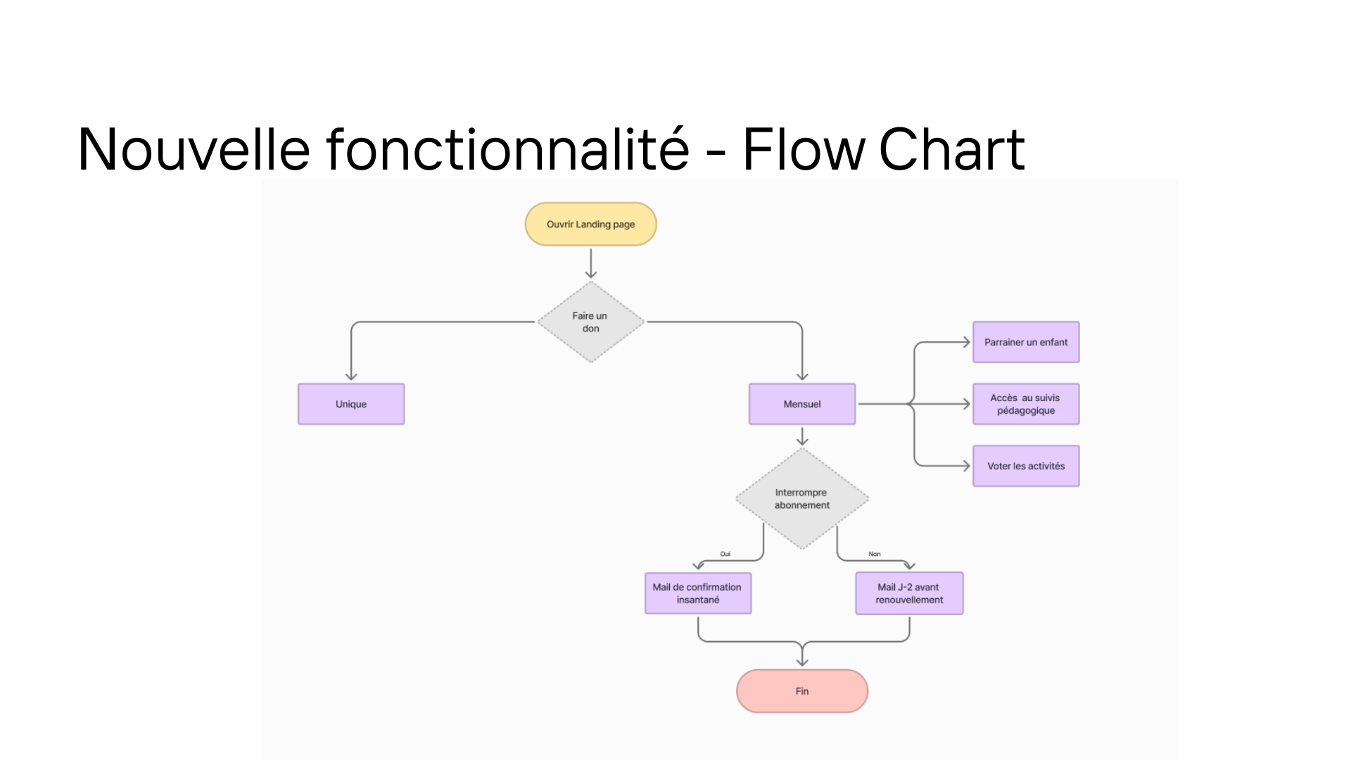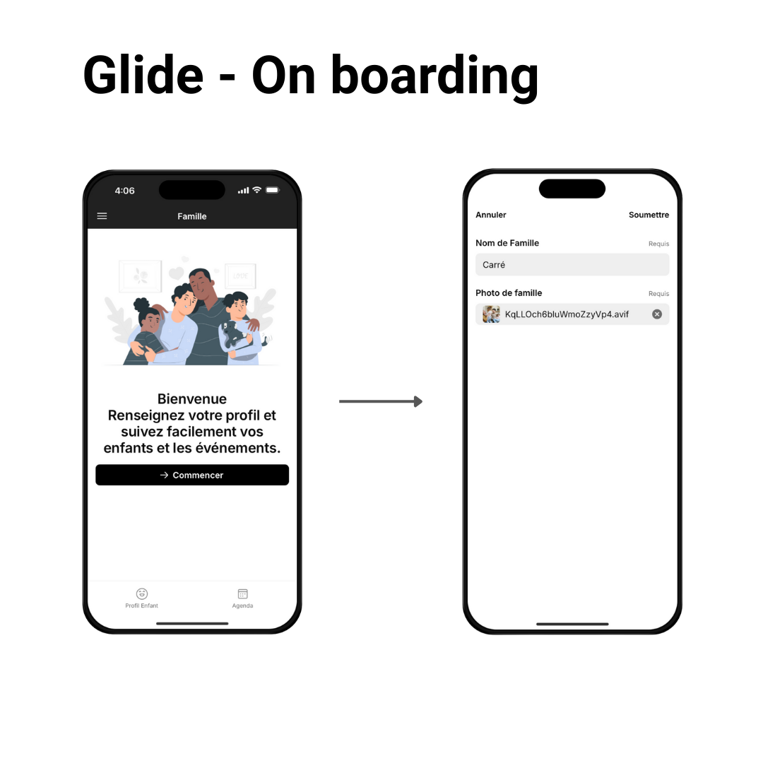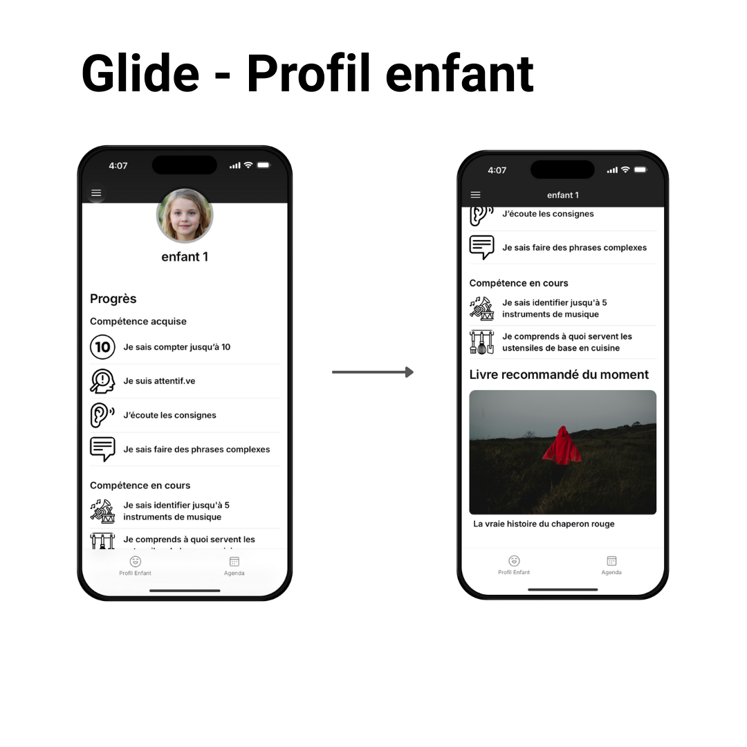 Le projet a abouti à la livraison d'un MVP fonctionnel déployé sur deux plateformes : une application mobile no-code sur Glide (onboarding, profil enfant, agenda, déclaration d'allergies) et une landing page sur Webflow structurée en 4 sections. La base de données Glide modélise 8 tables interconnectées, couvrant profils, compétences, progression et gestion des événements. Le design system documenté sur Zeroheight en 7 sections — logo, couleurs, typographie, iconographie, composants, illustrations — assure la cohérence visuelle sur les deux surfaces. Le flow chart du parcours de don (unique vs mensuel, 3 options d'abonnement, gestion de résiliation) a directement outillé le dialogue avec le développeur. La roadmap UX en 4 étapes (tests utilisateurs, amélioration continue, suivi des données, projection moyen terme) pose le cadre des prochaines itérations.