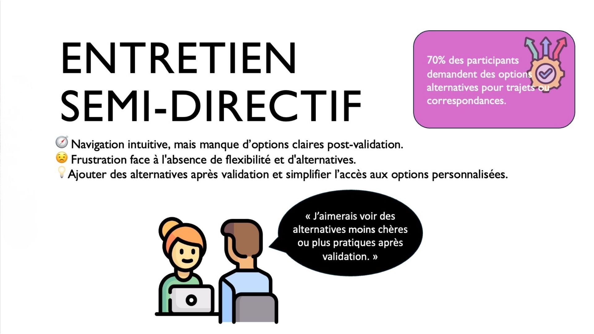 Cette phase de recherche a produit une base UX solide et directement exploitable : 5 entretiens semi-directifs et 5 sessions d'observation shadowing menés auprès de profils variés (professionnels, seniors, personnes en situation de handicap), complétés par une recherche secondaire appuyée sur les données INSEE. 80% des participants se sont révélés frustrés par l'interface existante, et 70% ont exprimé le besoin d'alternatives flexibles post-validation. Ces résultats ont permis d'identifier 3 axes prioritaires — fluidité du parcours, accessibilité et clarté tarifaire — formalisés dans une roadmap UX en 4 étapes, prête à guider l'équipe produit vers un développement centré utilisateur.